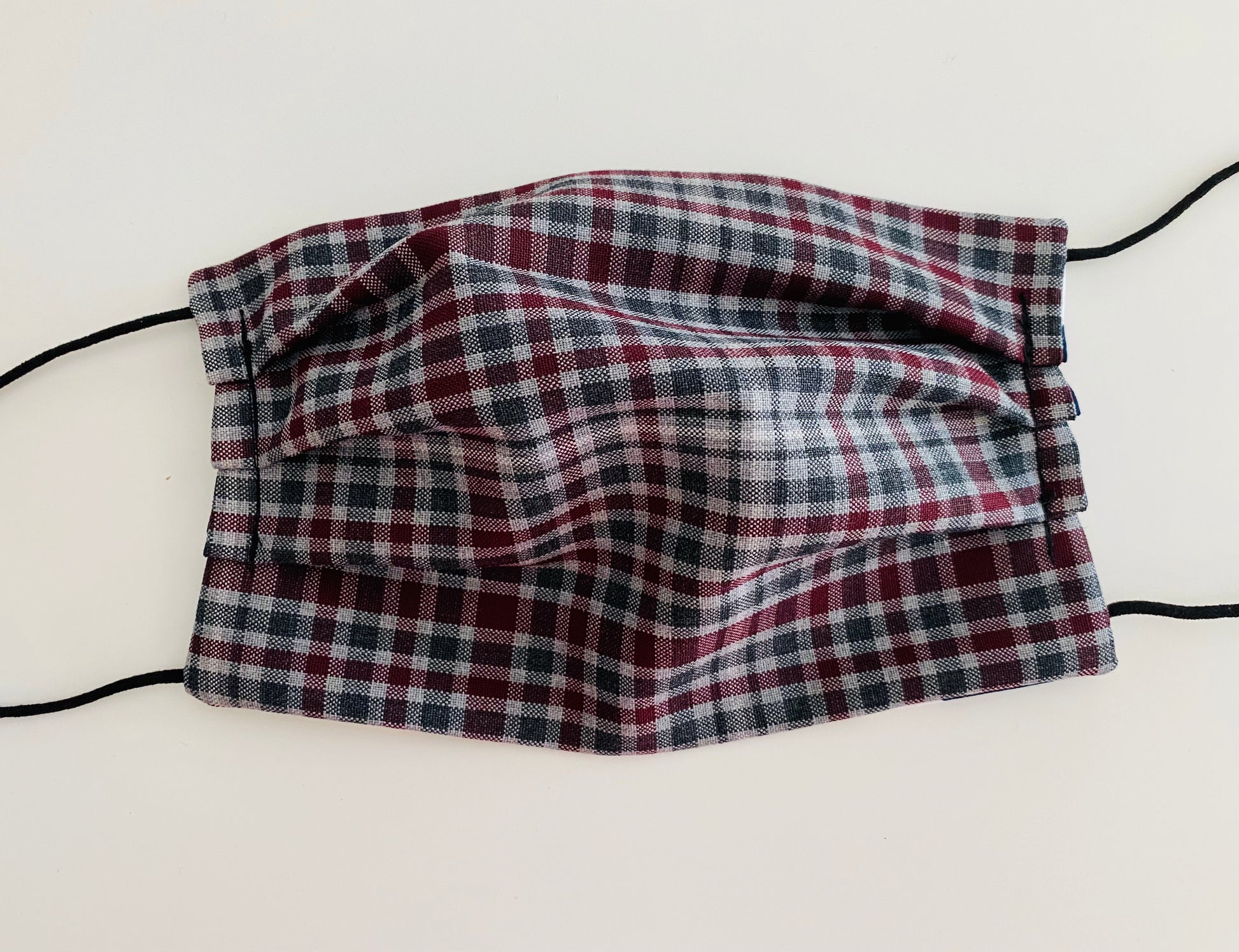 Maroon and grey checks face coverings made with 100% cotton fabric and soft cord for around the ears which is adjustable and comes with instructions.