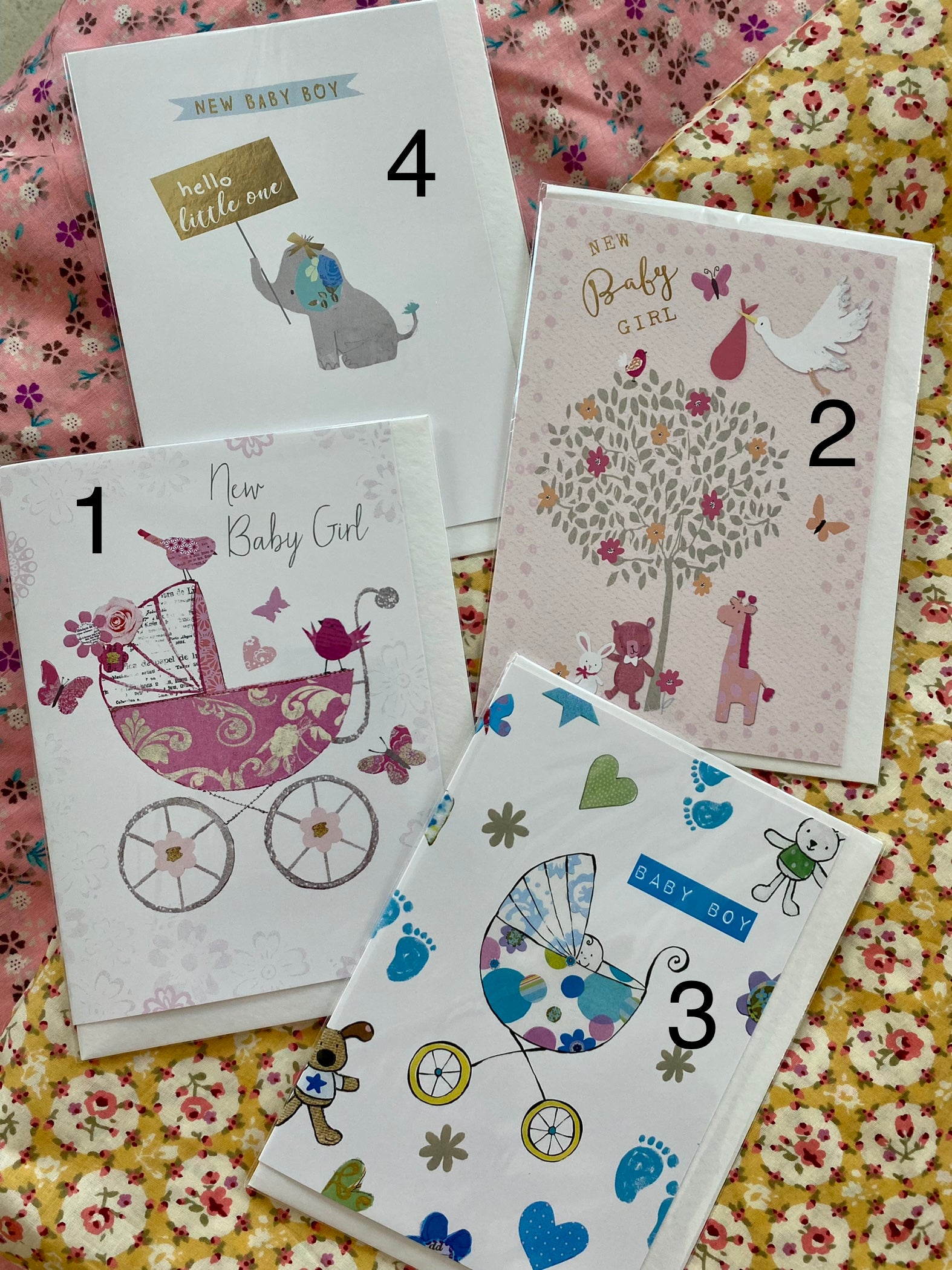 4 pretty choices of newborn congratulations cards in either boy or girl theme.