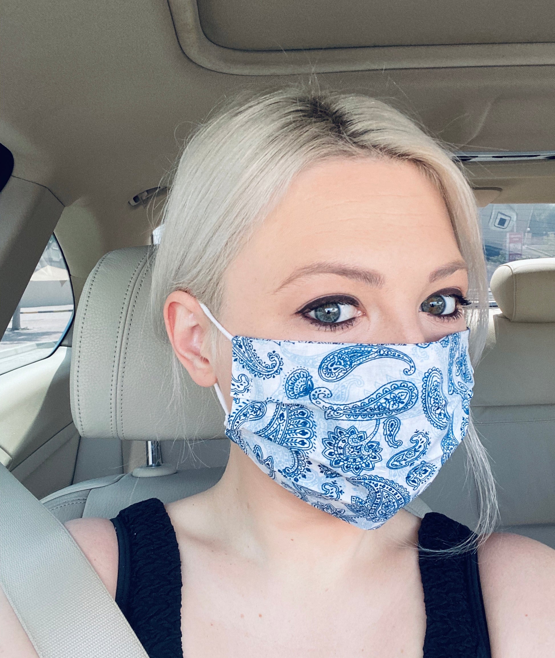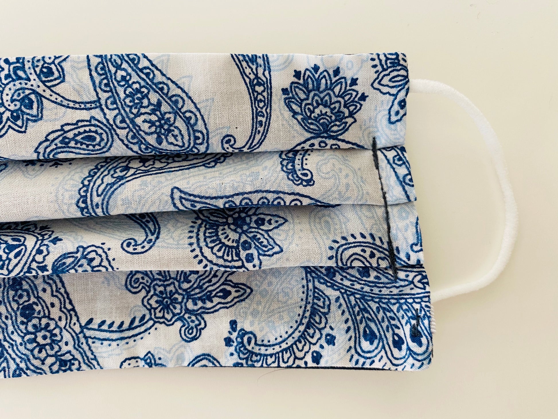 White and navy face coverings made with 100% cotton fabric and soft cord for around the ears which is adjustable and comes with instructions.